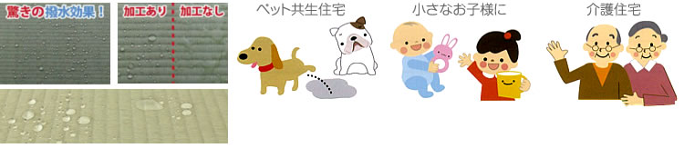 そこで、イ草に撥水効果を持たせることで、天然のイ草で織った畳表で作られた畳の良さはそのままに、問題視されている短所をカバーできる、お手入れが簡単で、カビの発生を抑制した新しい畳です。