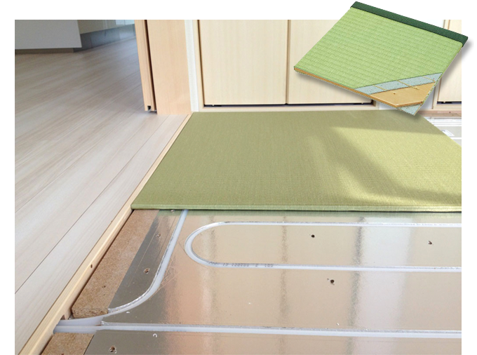 厚さ8ミリの薄くて熱貫流率が高いアルミ二ウム両面張りベニヤ板を使用しており、熱による反りや寸法変化が少ない床暖房対応タイプ。 畳表は、乾燥にも強く、熱で変形しない和紙畳がおすすめ。