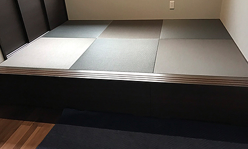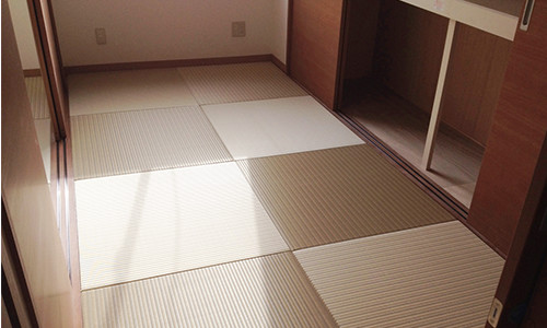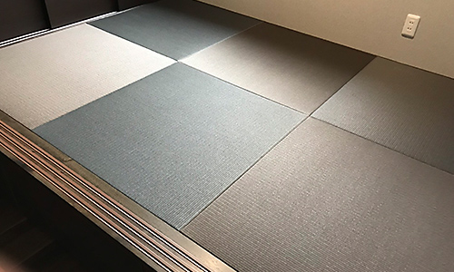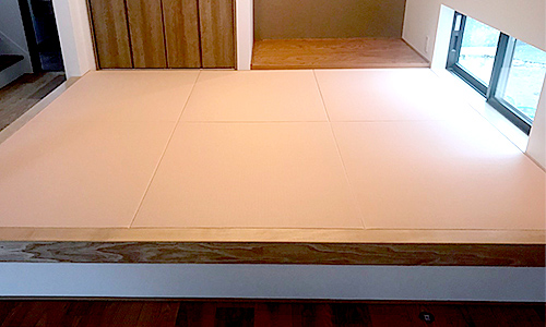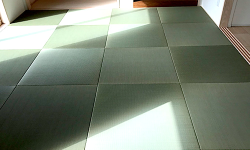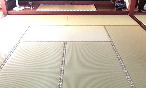 10年以上を経て、畳の表面のデコボコや日焼けが気になること、劣化によるささくれが衣類に着くなどの悩みがあり、法事を機に畳替え。仕上がった畳は、洋服や足裏に白い粉(泥)が付くこともなく、現代的なオリジナル縁で明るい和室へと完成。
